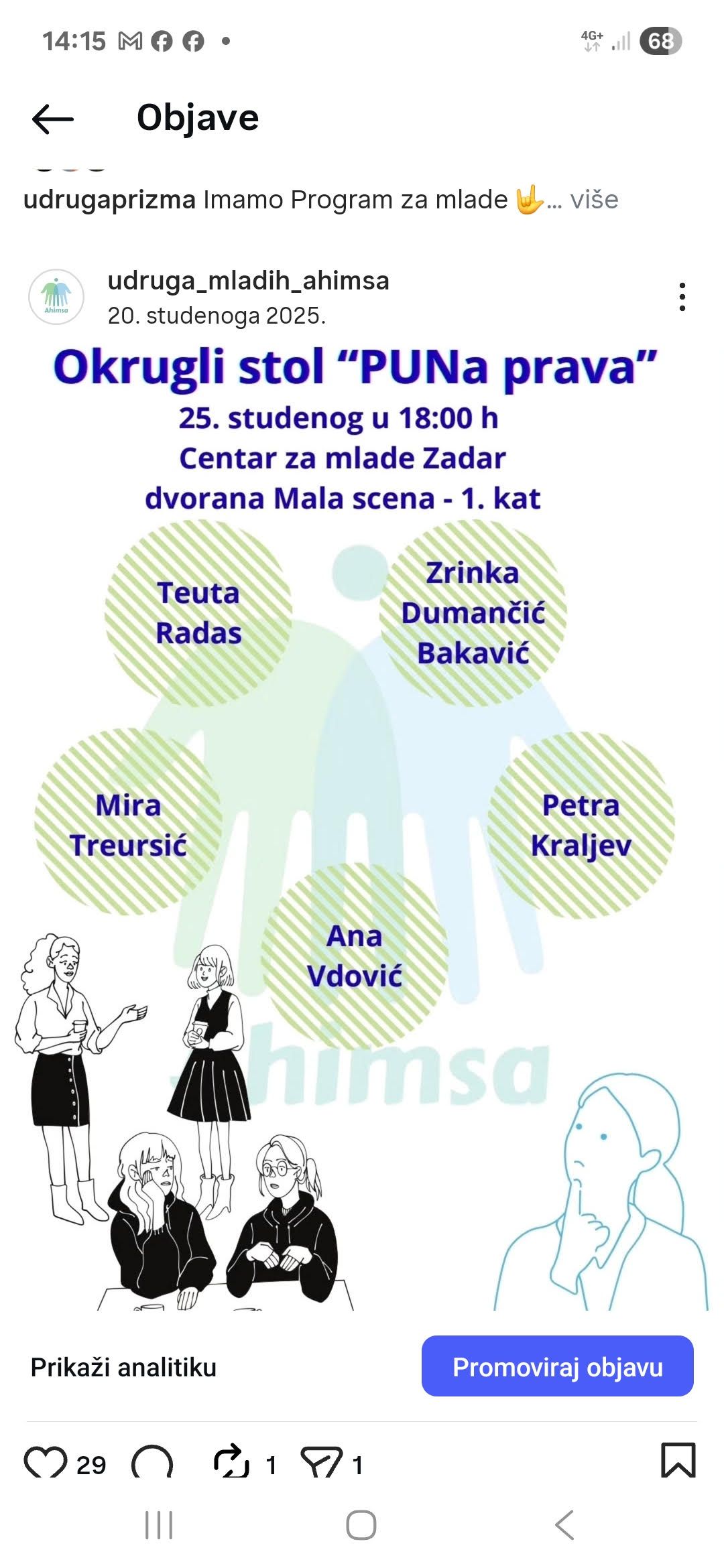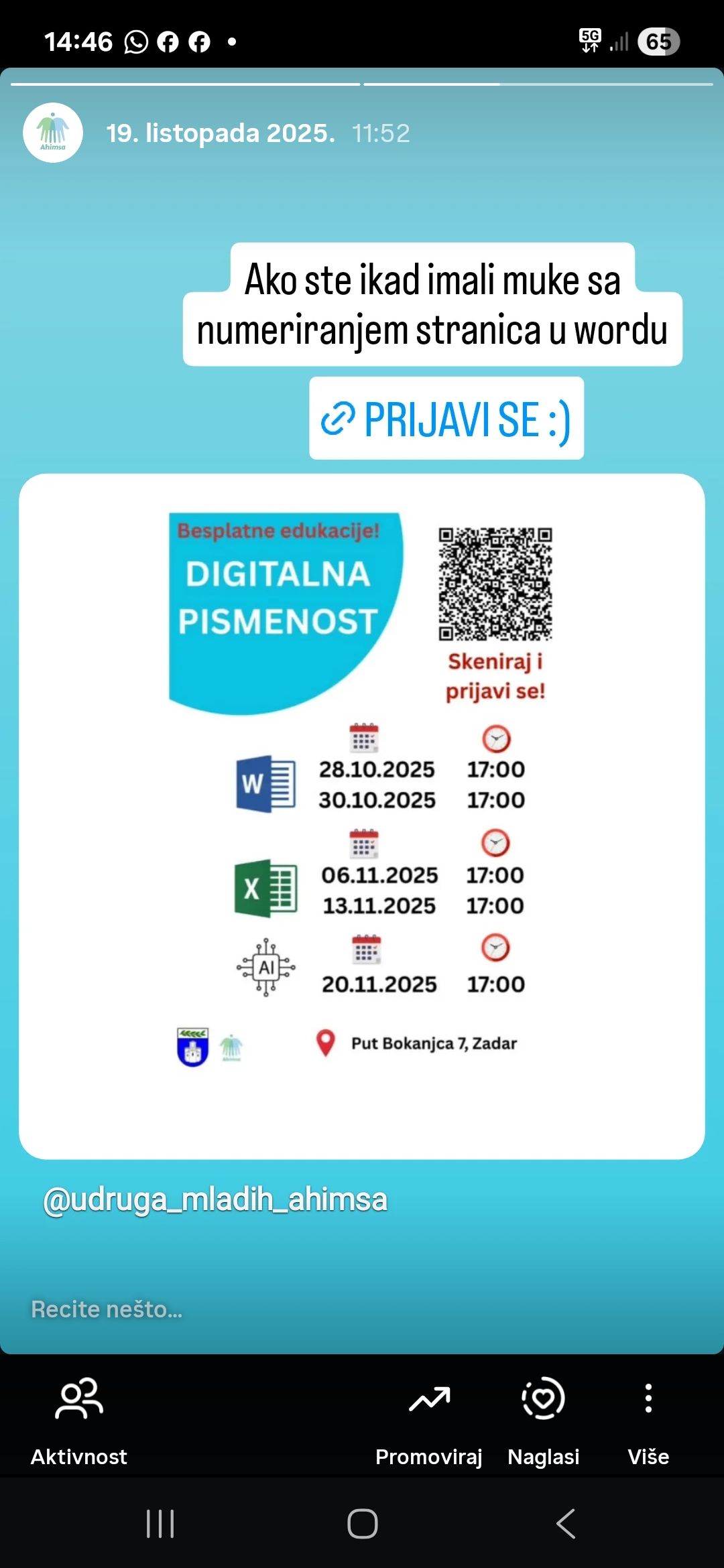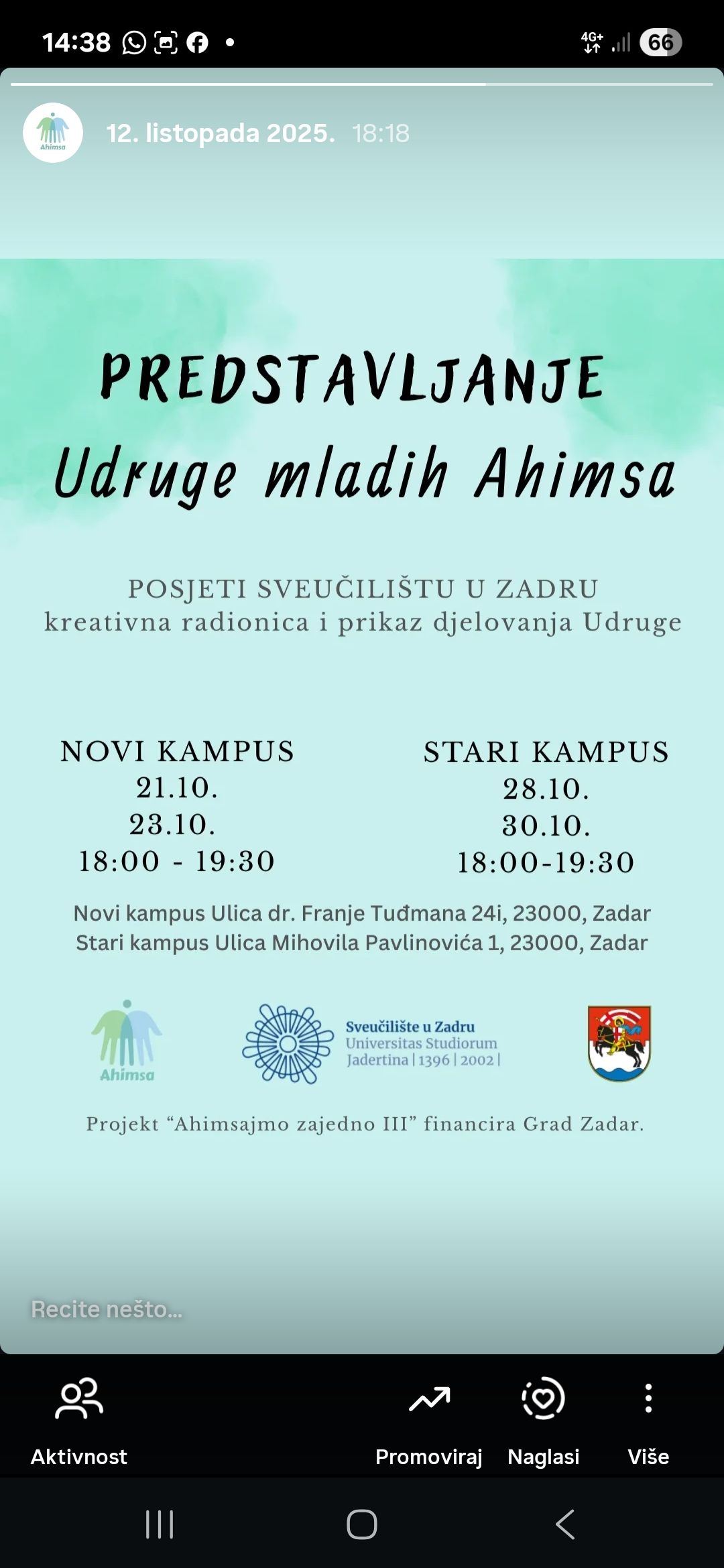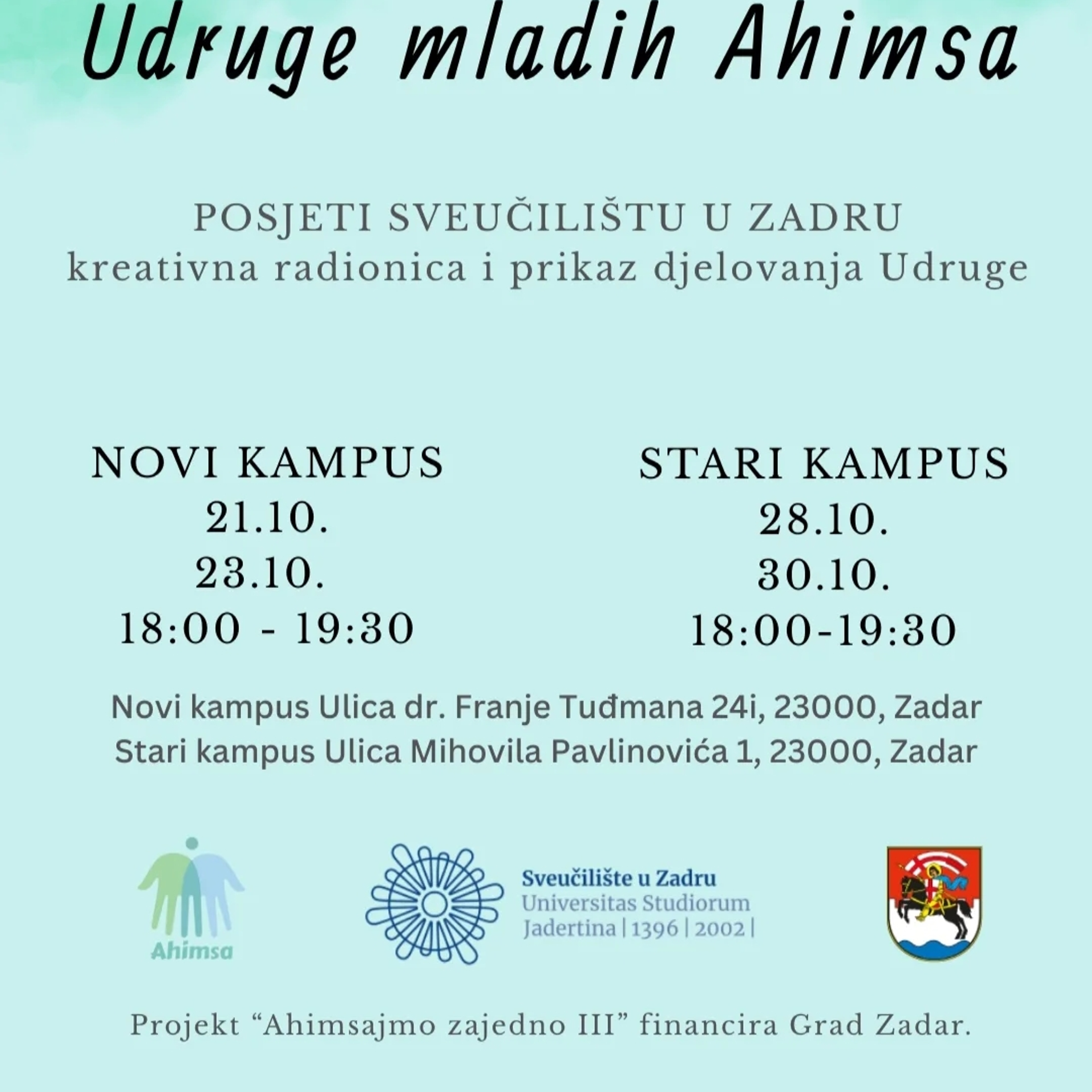 Udruga mladih Ahimsa (sanskrt: nenasilje, ljubav, suosjećanje) iz Zadra osnovana je krajem 2016. godine. Zamislili smo naš rad kroz razne radionice, organiziranje događaja, volontiranje i puno zabave.