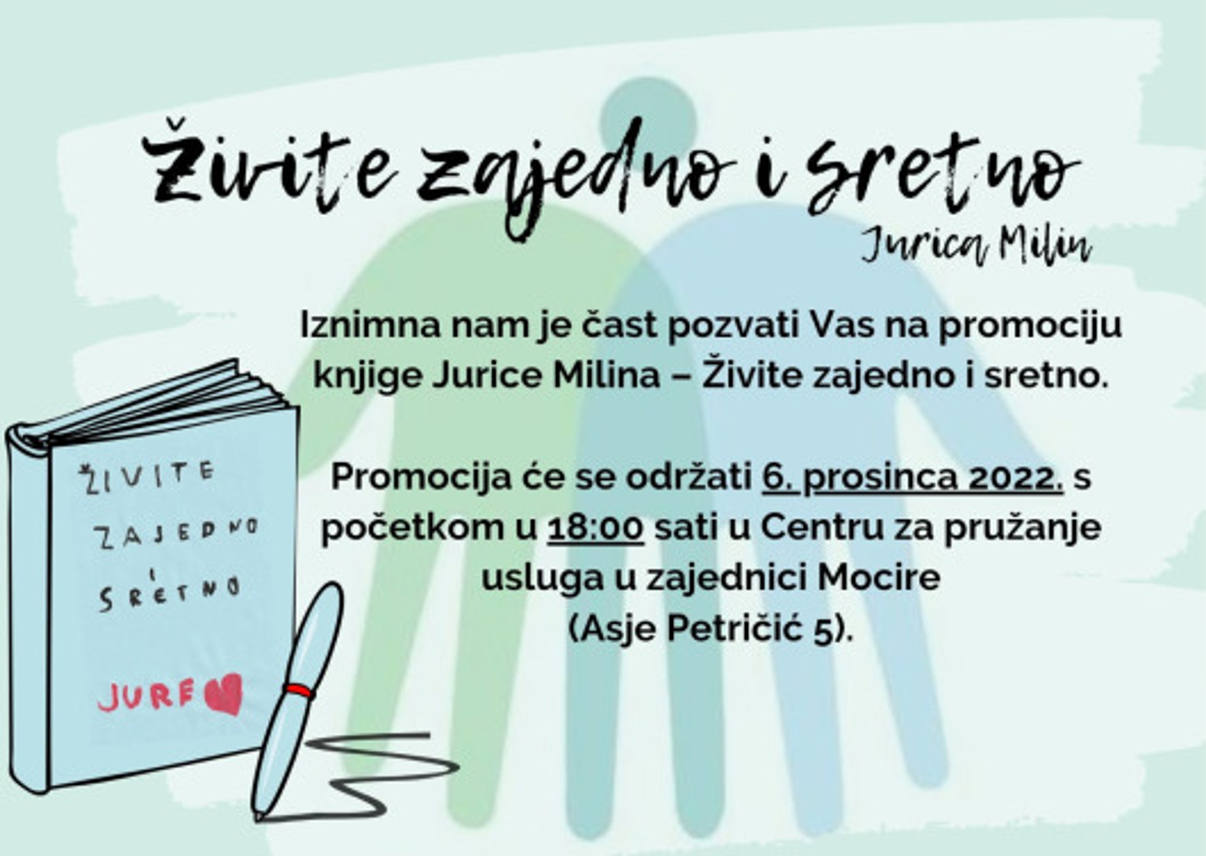 Došao je i taj dan! Promocija knjige Jurice Milina Živite zajedno i sretno održat će se u utorak, 06.prosinca 2022. godine s početkom u 18:00 u „Centru za pružanje usluga u zajednici Mocire”. Svi ste dobrodošli i nadamo se da se vidimo u što većem broju!